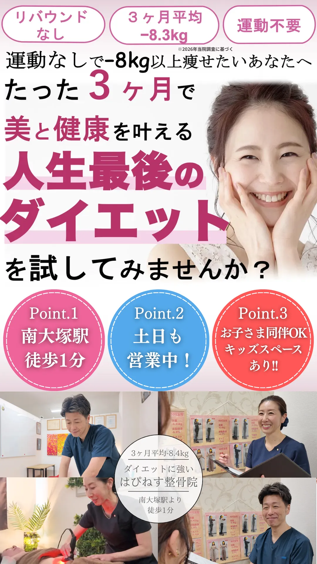 はぴねす整骨院では、あなたのダイエットを最初から最後まで責任を持って真摯に向き合い、結果にこだわっていきます。